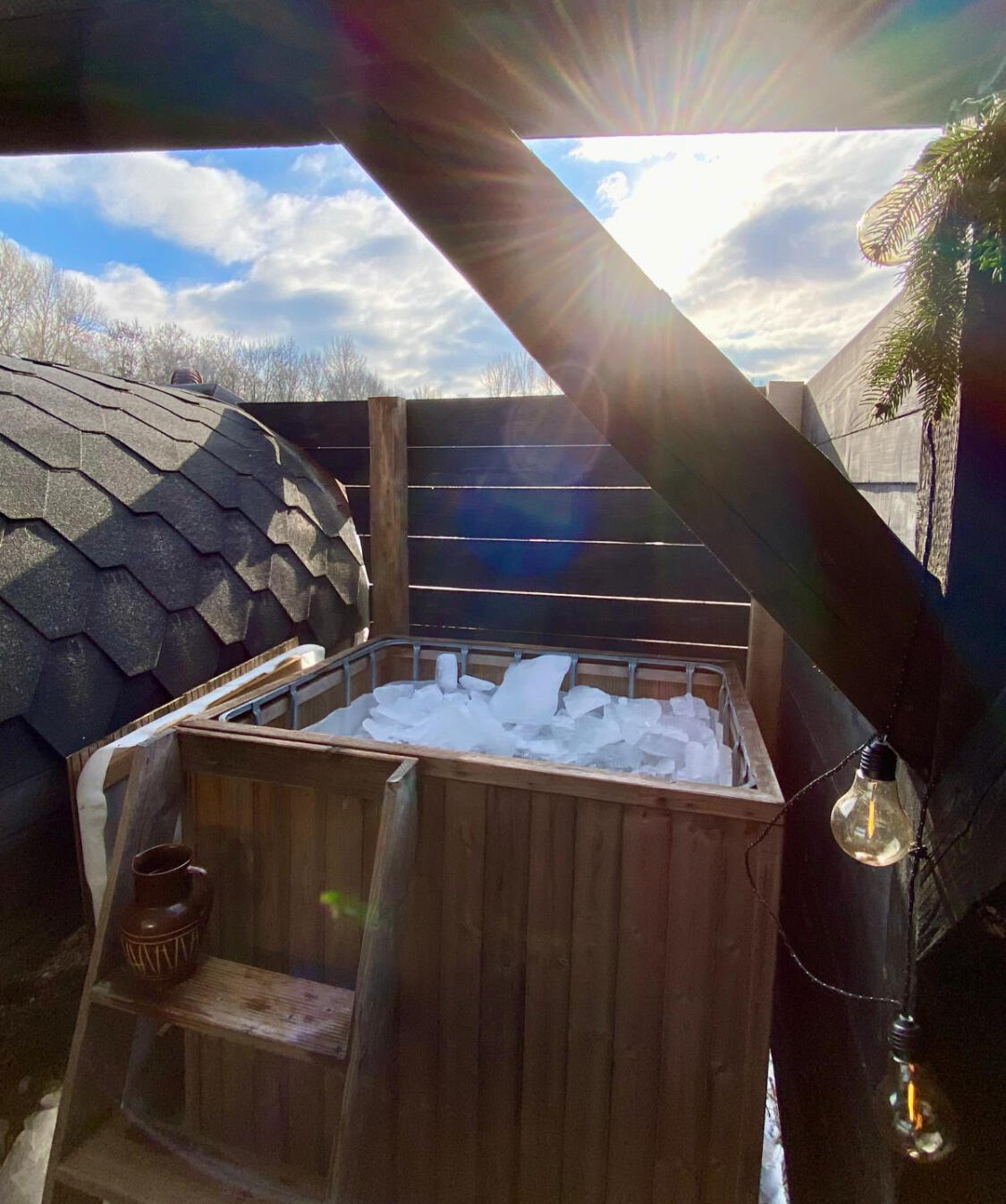 rozkúrenú saunu s pecou na drevoochladzovaciu kaďu s džbánomvonkajšiu osviežovňu s výhľadom na krajinu a lesvodu a čajuteráky a plachty na zapožičanie za 1,5e/ksesenciálne olejesaunové čiapky