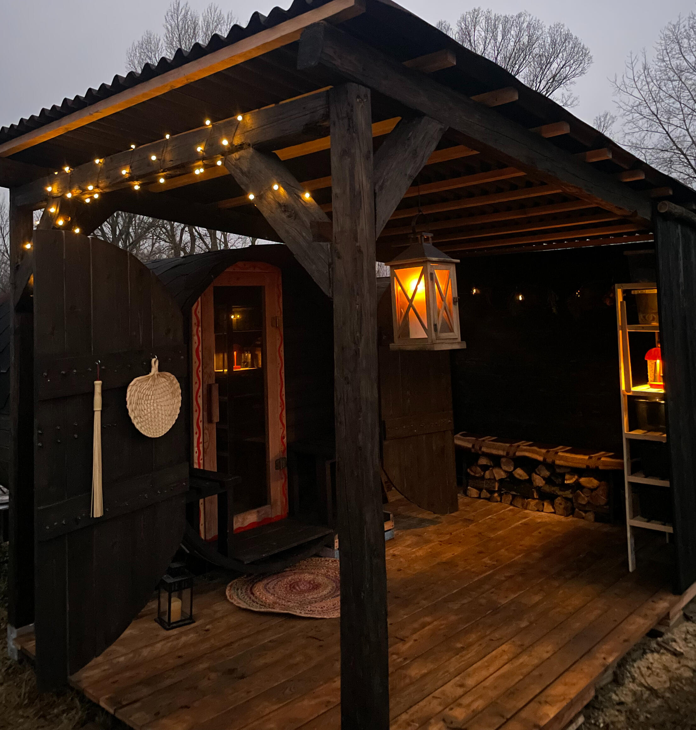 rozkúrenú saunu s pecou na drevoochladzovaciu kaďu s džbánomvonkajšiu osviežovňu s výhľadom na krajinu a lesvodu a čajuteráky a plachty na zapožičanie za 1,5e/ksesenciálne olejesaunové čiapky